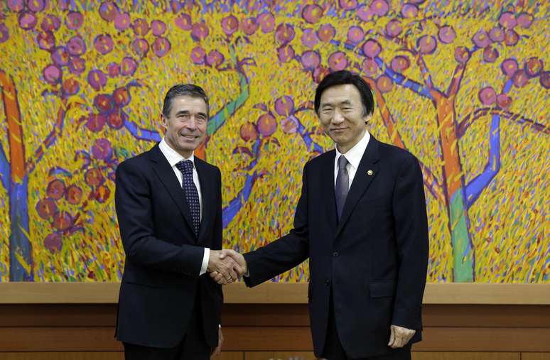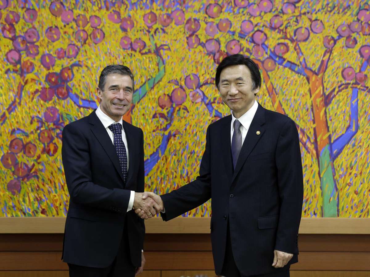 O secretário-geral da Otan, Anders Fogh Rasmussen (esq.), cumprimenta o ministro sul-coreano do Exterior, Yun Byung-se, em Seul