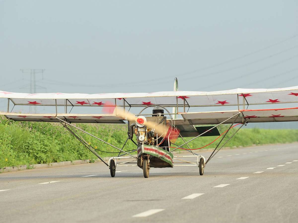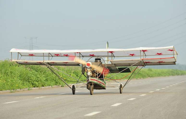 Ding Shilu opera avião caseiro em teste de voo nos arredores de Shenyang, na província de Liaoning. Ding, 65 anos, gastou 2 mil yuans (US$ 327) para construir um avião de 5 metros de comprimento e 4,5 metros de altura utilizando componentes reciclados de motocicletas e bicicletas elétricas