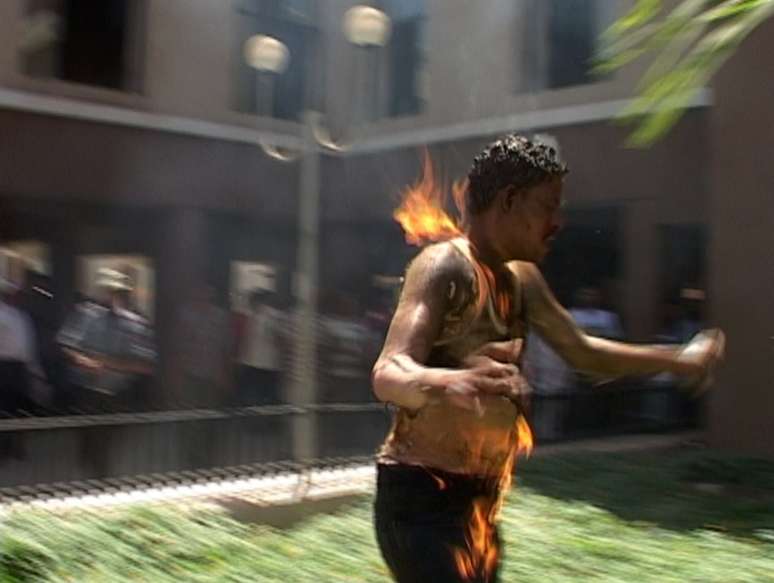 Bombeiro indiano usa sua camisa para apagar as chamas de um dos manifestantes