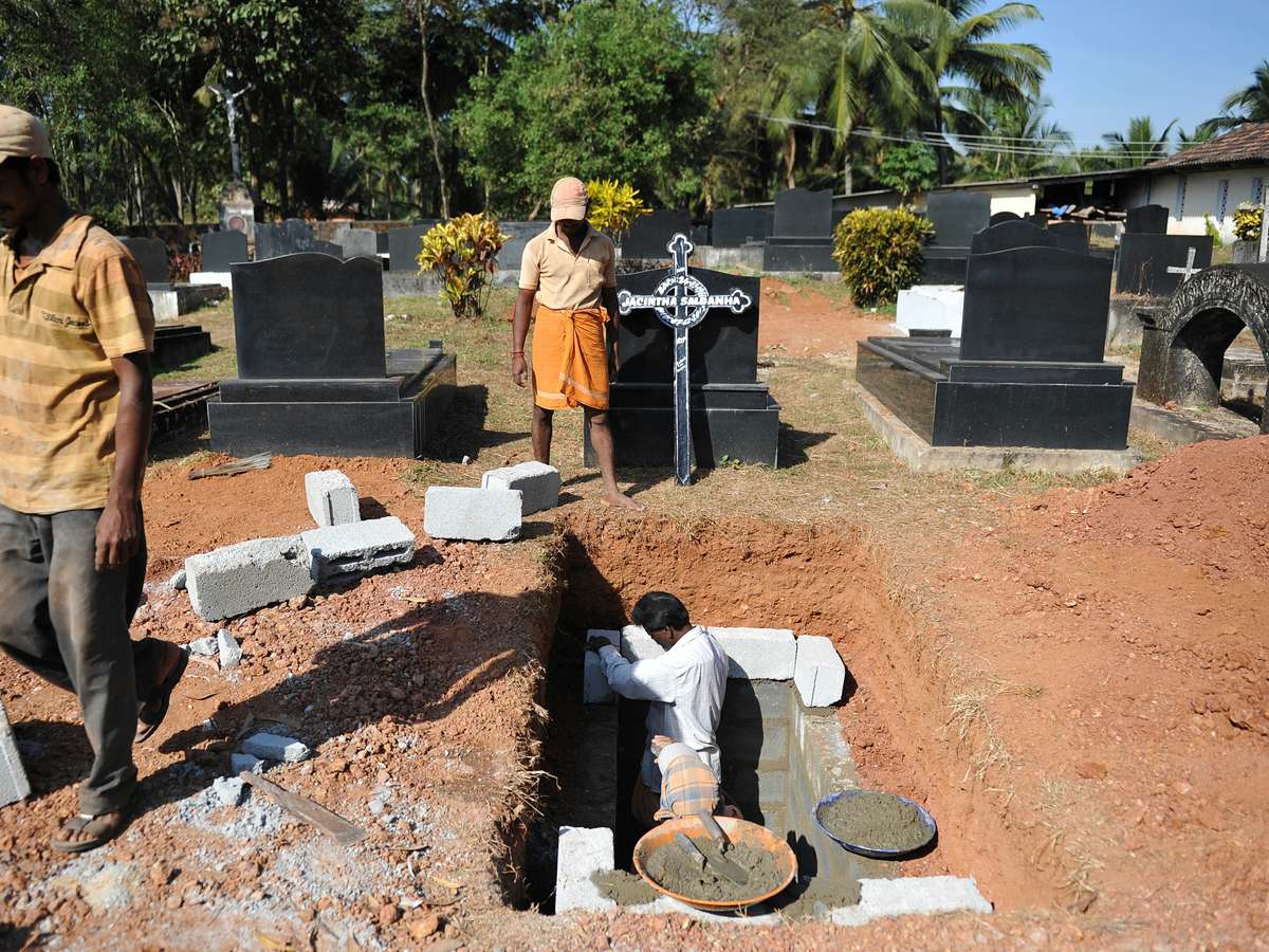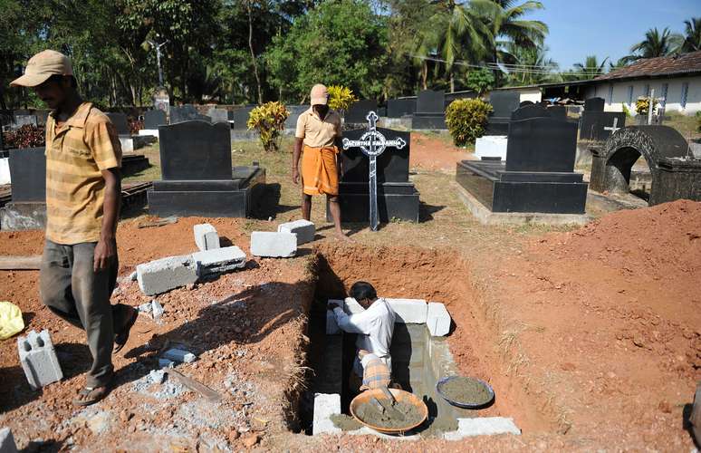 Trabalhadores indianos preparam o túmulo de Jacintha Saldanha, de acordo com a tradição local; o funeral será realizado na segunda-feira perto de Mangalore, em Shirva, cidade natal do marido da enfermeira