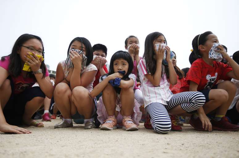 Estudantes sul-coreanos participam de exercício de evacuação como parte de um treinamento de defesa em Seul. Desde o naufrágio da embarcação Sewol há 2 meses, que deixou cerca de 300 mortos, o treinamento desta sexta-feira, que durou aproximadamente 20 minutos, foi o maior do país, de acordo com a mídia local, e envolveu, além de escolas, prédios do governo, cinemas, lojas e terminais de ônibus em vários locais da Coreia do Sul