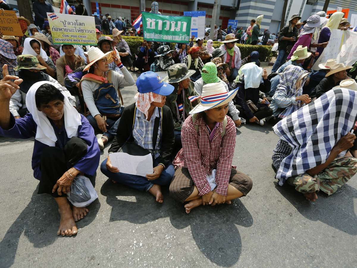 Os arrozeiros, que desde quinta-feira acampam na frente do Ministério de Comércio, marcharam rumo ao Ministério da Justiça e um escritório que a primeira-ministra interina, Yingluck Shinawatra, utiliza provisoriamente.
