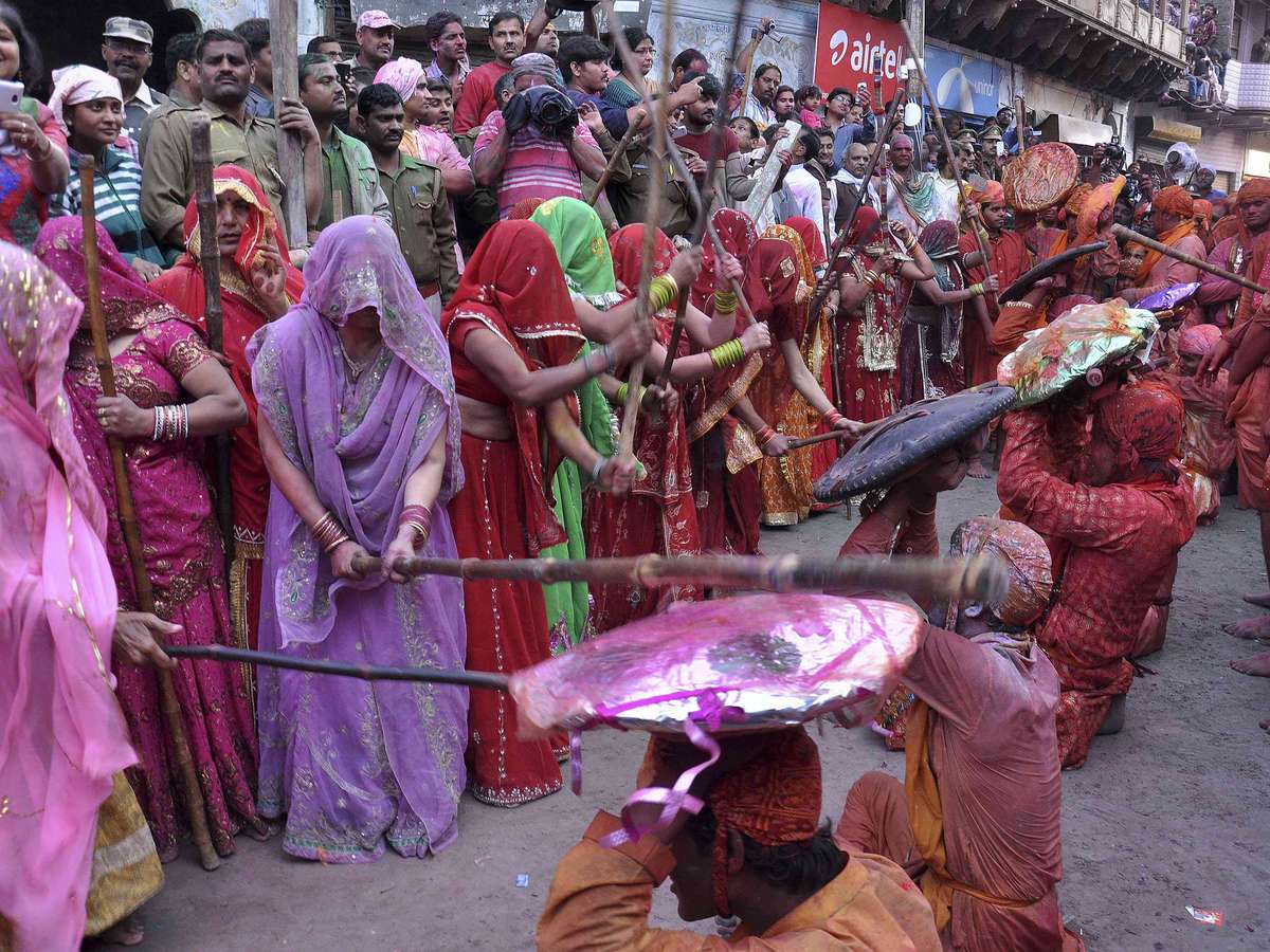 Um grupo de mulheres "batem" em homens segurando um escudo sobre suas cabeças durante o Lathmar Holi, na aldeia de Barsana, no estado indiano de Uttar Pradesh, em 9 de março. Na tradição, típica das aldeais de Barsana e Nandgaon, os homens cantam canções provocativas para ganhar a atenção das mulheres, que , em seguida, "batem" neles com varas de bambu chamadas lathis