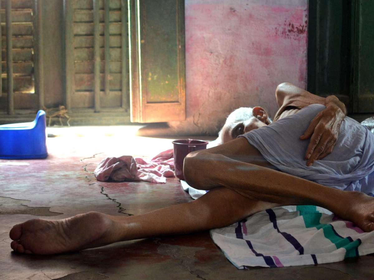 No andar superior, Nutan Chaudhary, de 52 anos, estava plenamente consciente de que seu pai se encontrava em "seus últimos dias". O ancião, extremamente miúdo, estava doente de câncer e jazia em seu leito de morte com uma tela branca como única vestimenta.