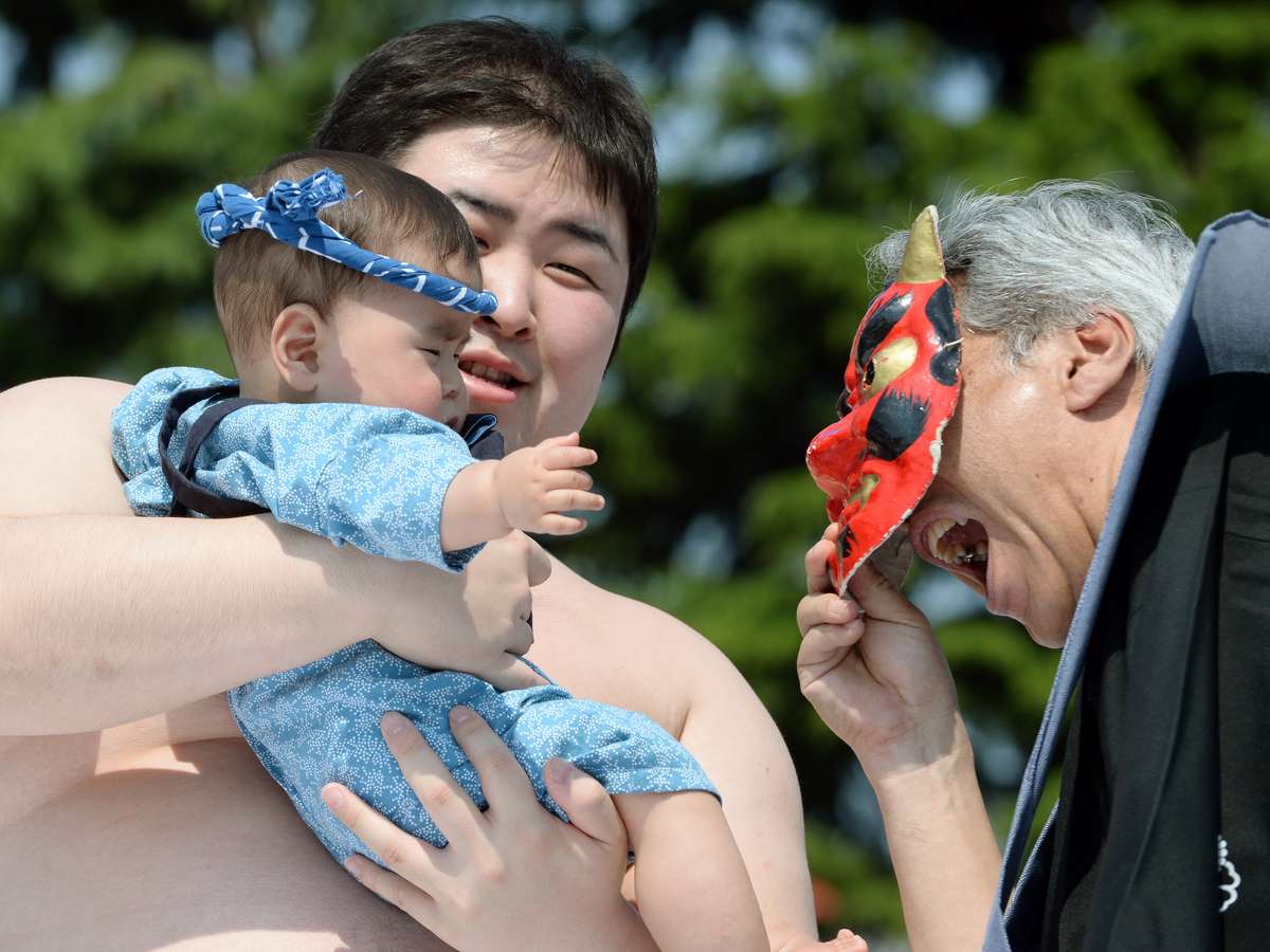 Um árbitro tenta fazer um bebê chorar usando uma máscara durante o concurso "Baby-cry Sumo", no templo Sensoji, em Tóquio , em 26 de abril