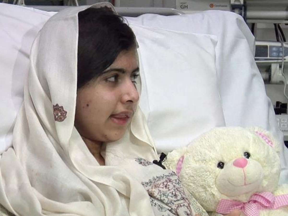 Malala levou um tiro na cabeça à queima-roupa em outubro do Taliban por defender a educação para meninas, e foi levada à Grã-Bretanha para tratamento.
