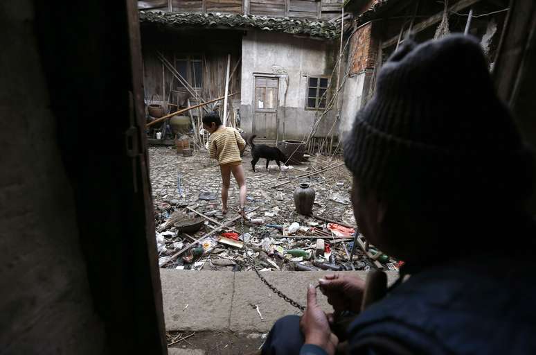 He Zili, 11 anos, brinca em um jardim enquanto seu avô segura uma corrente ligada ao seu tornozelo na casa da família em Zhejiang, na China. O menino bateu a cabeça quando tinha 1 ano e passou a sofrer de desordens mentais. De acordo com a família, eles não tinham outra opção a não ser acorrentá-lo, porque o garoto tem uma tendência de atacar as pessoas ao seu redor. Zili está atualmente sob os cuidados de seu avô, que é fisicamente inválido, e seu pai, que sofre de deficiência mental. A mãe do menino morreu de câncer