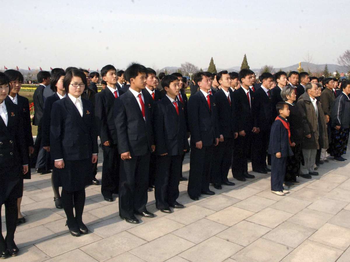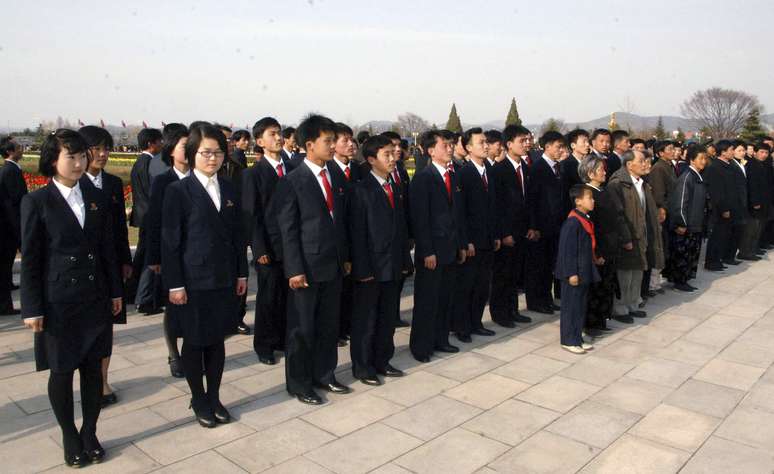 Trabalhadores visitam praça em frente ao Palácio Kumsusan, em Pyongyang, durante comemoração do aniversário de 101 anos do nascimento de Kim Il-sung, fundador da Coreia do Norte. Ao contrário das expectativas de que a data poderia ser marcada por o lançamento de um míssil, a Coreia do Norte até o momento celebrou a memória do avô do atual líder, Kim Jong-un, sem promover o aumento da escalada de tensões com a Coreia do Sul e os Estados Unidos