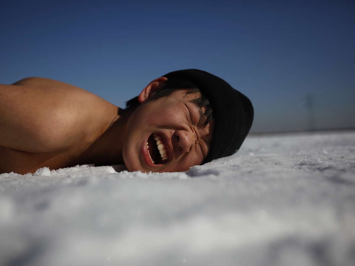 Estudante faz careta ao fazer exercícios deitado na neve. Crianças de 11 a 17 anos se reuniram em Ansan, ao sul de Seul, para um acampamento militar de inverno. O treinamento, que não é obrigatório e é oferecido por fuzileiros navais aposentados, dura entre 4 e 14 dias