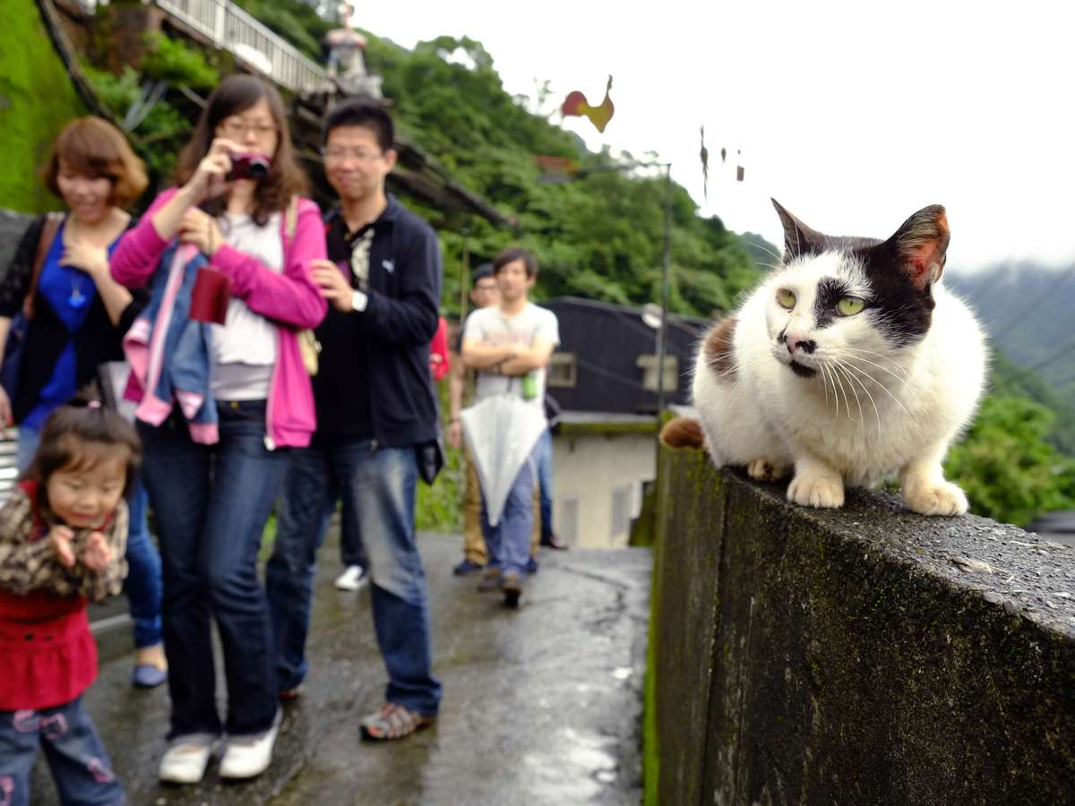 Turistas para para tirar fotos de gato em muro na pequena cidade de Houtong, em Taiwan. Esta antiga comunidade de mineradores de carvão tem atraído turistas graças à sua enorme população de gatos. Visitantes vão à cidade especialmente para brincar e fotografar os felinos. Aproveitando o inesperado aumento do turismo, moradores locais construíra pontos de alimentação, pedestais e até elevadas sobre ferrovias para facilitar a locomocação de visitantes e dos animais