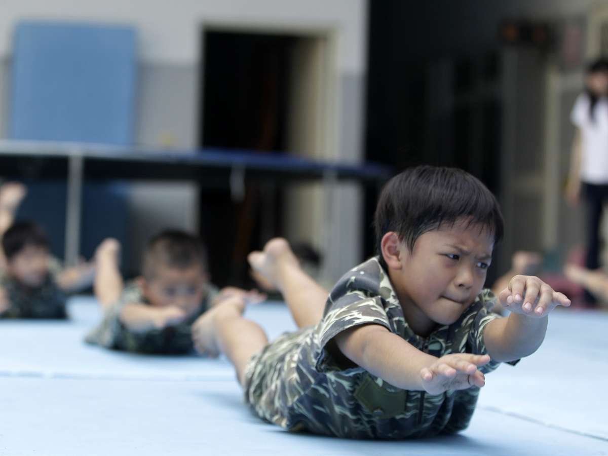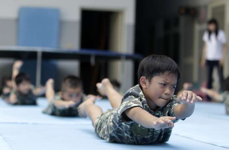 Crianças com roupas camufladas participam de sessão de treinamento físico em jardim de infância na localidade de Taiching. Uma escola local está oferecendo treinamento físico que consiste na combinação de treinos de fuzileiros navais com ginastas para crianças pequenas. O objetivo, segundo o diretor, é ajudá-las a crescer com o corpo e a mente saudáveis
