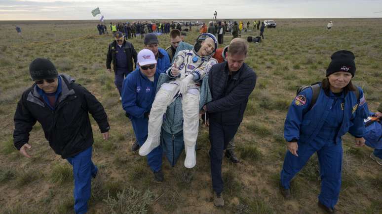 "O trio deixou a estação espacial no sábado às 18h57 (horário de Washington) a bordo da nave espacial Soyuz MS-26, antes de pousar em segurança com a ajuda de um paraquedas a sudeste da cidade de Zhezkazgan, no Cazaquistão", informou a agência espacial norte-americana.