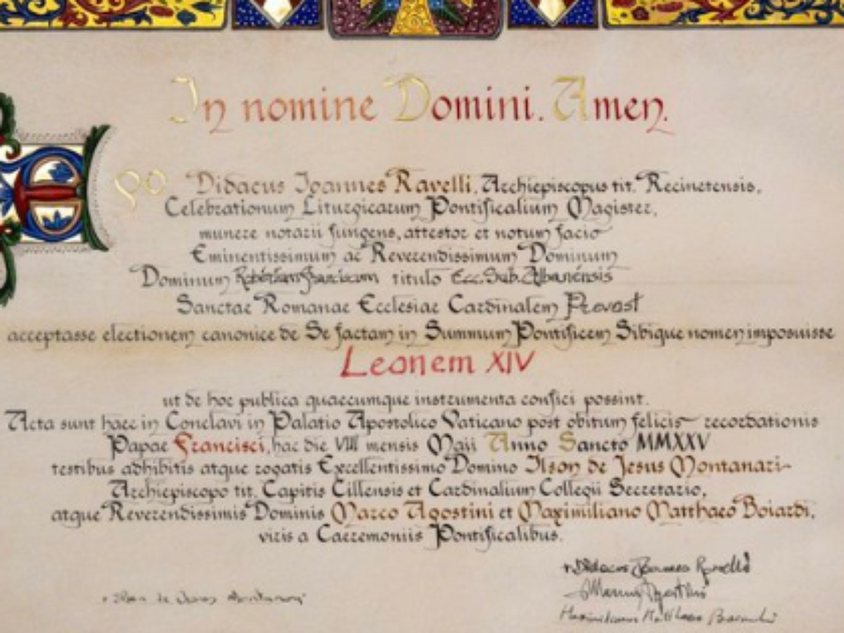 Na ata, lavrada pelo Mestre das Celebrações Litúrgicas Pontifícias, Monsenhor Diego Giovanni Ravelli, na qualidade de notário, há um texto escrito em latim com as palavras “Leaonem XIV” escritas em vermelho. Uma imagem do documento foi publicada na conta X (antigo Twitter) do Departamento das Celebrações Litúrgicas do Sumo Pontífice.