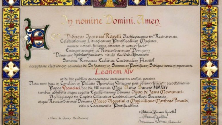 A “ata de aceitação”, documento que formaliza a escolha do novo papa, foi publicada na manhã desta sexta-feira, 9. O cardeal norte-americano Robert Francis Prevost, de 69 anos, foi eleito para o cargo no segundo dia de conclave e escolheu como nome “Leão XIV”.