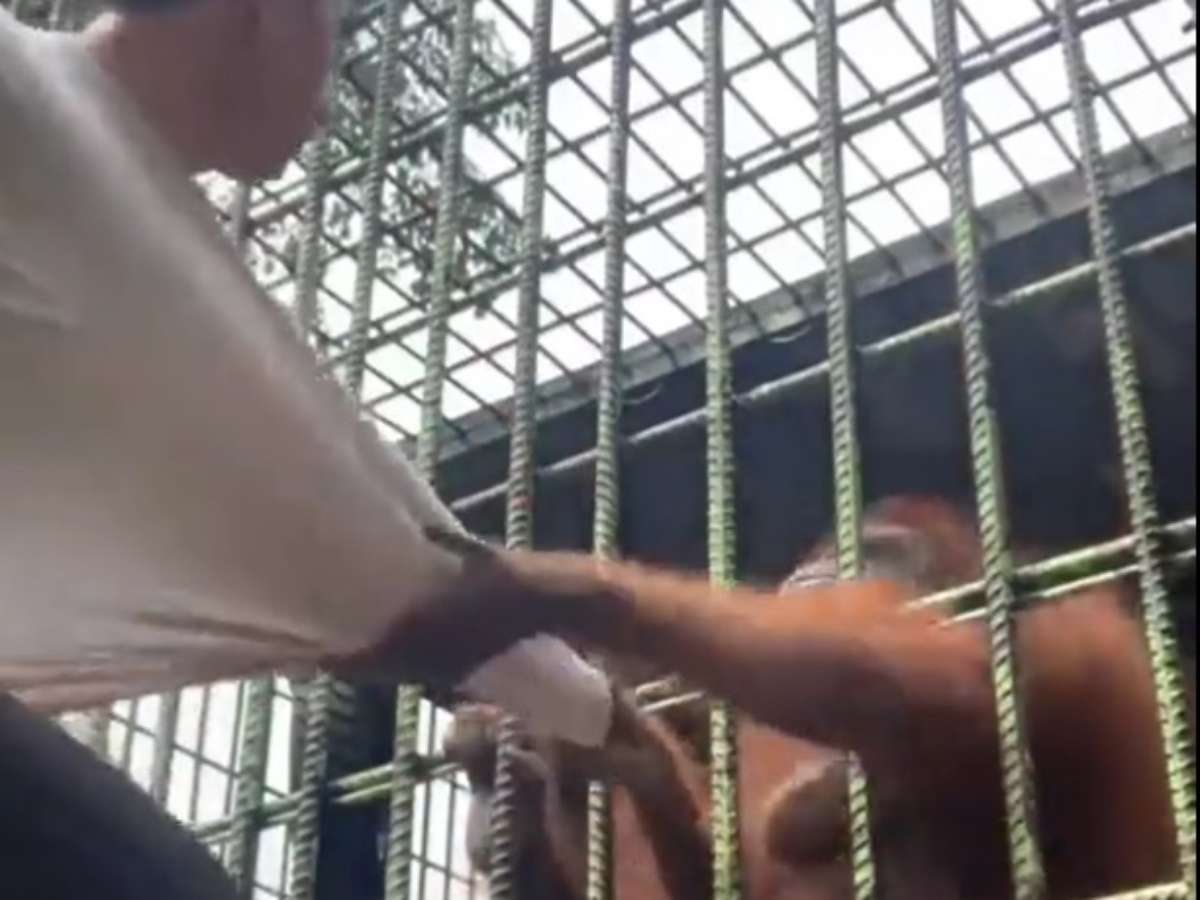 Um ataque de um orangotango a um homem viralizou nas redes sociais nesta terça-feira (8). O vídeo mostra o animal atravessando as barras de sua jaula no zoológico e se recusando a soltá-lo. As imagens foram amplamente compartilhadas, inclusive pelo astro do cinema Jamie Foxx.