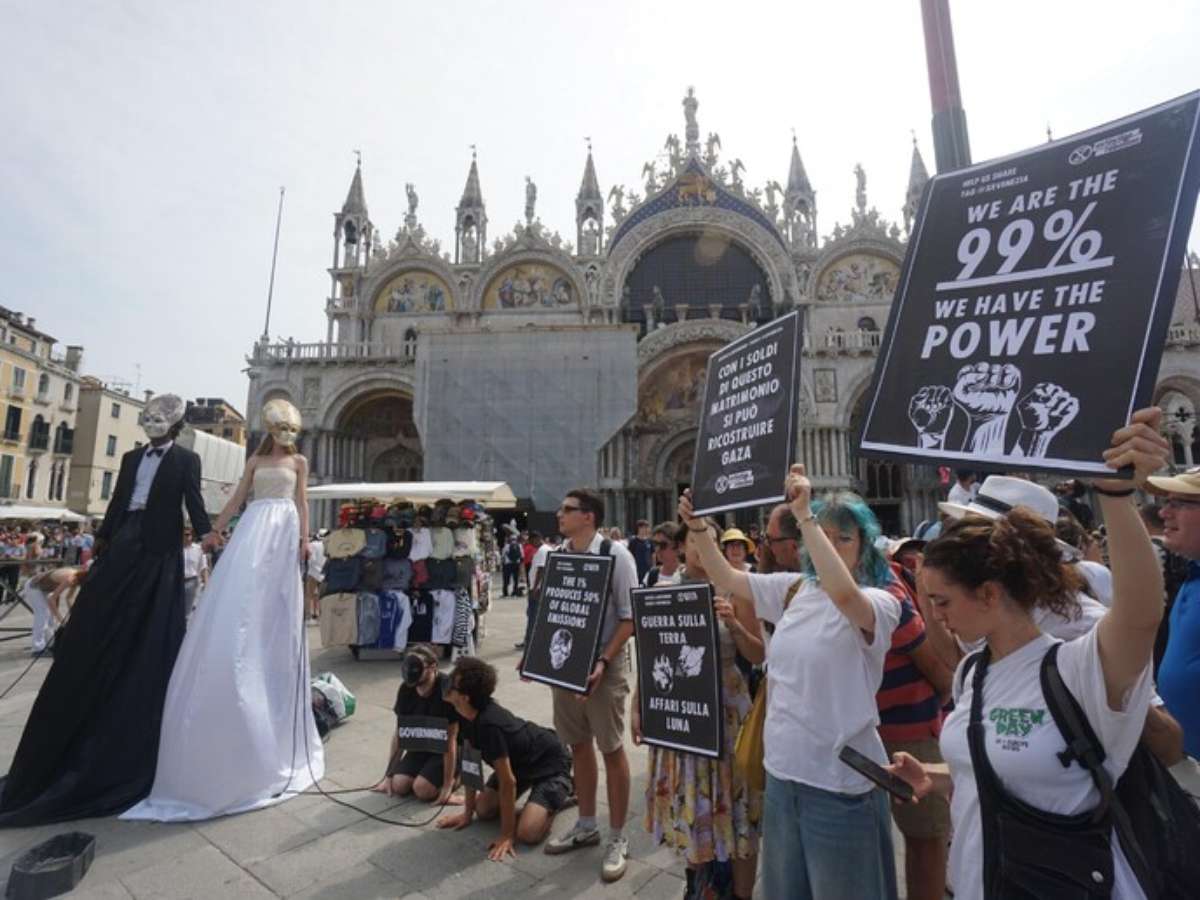 Além disso, cartazes lembravam que o 1% mais rico concentra 45% da riqueza do planeta e produz 50% das emissões de poluentes em todo o mundo. Os manifestos também exibiam frases como "Com o dinheiro desse casamento seria possível reconstruir Gaza", "Guerra na Terra e negócios na Lua", em referência à Blue Origin, empresa de turismo espacial de Bezos, e "O planeta está queimando, mas fiquem tranquilos, aqui está a lista de 27 vestidos de Lauren Sánchez", uma crítica à cobertura da imprensa sobre o matrimônio.