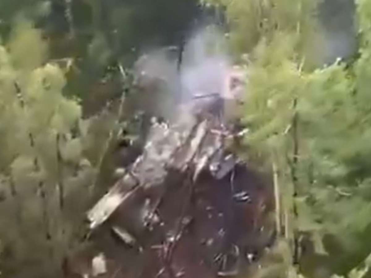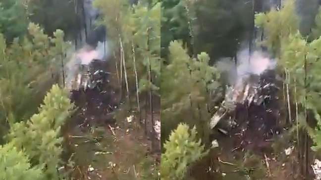 Imagens do local do acidente divulgadas pela mídia estatal russa mostram destroços espalhados pela densa floresta, cercados por colunas de fumaça.