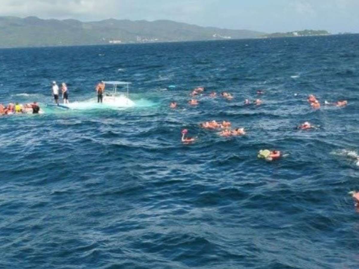 Nas redes sociais, vídeos mostram cerca de 55 pessoas flutuando na água enquanto equipes da Marinha Dominicana fazem o resgate usando boias e cordas.