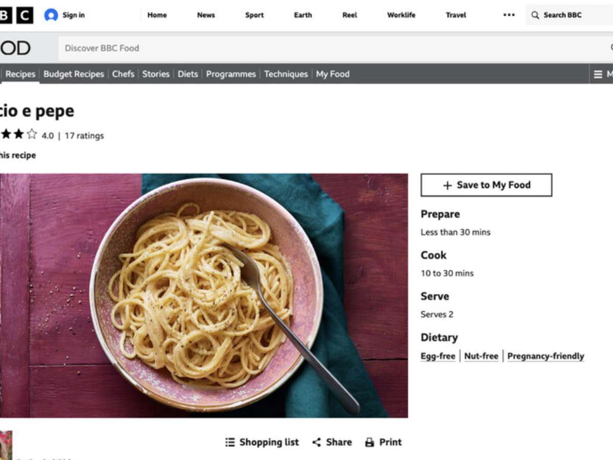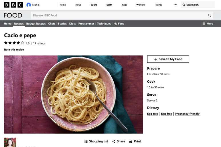 A seção dedicada à gastronomia "Good Food", no site da BBC, descreveu o prato romano icônico como uma receita que "não pode faltar na sua despensa" e "que poderia ser facilmente preparada para um almoço rápido", com apenas "quatro ingredientes simples: espaguete, pimenta, parmesão e manteiga".