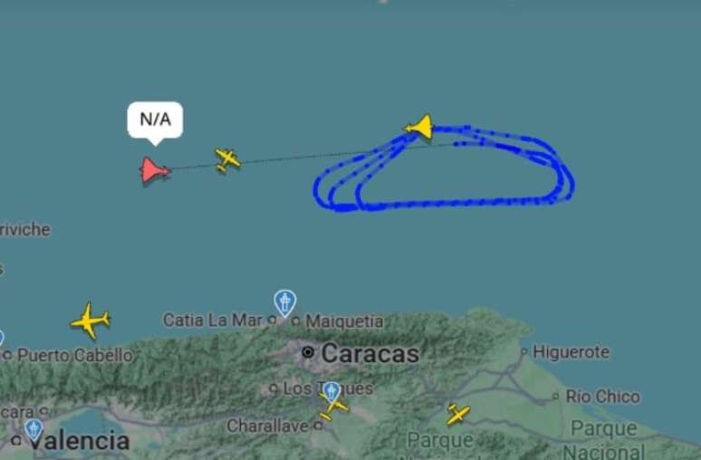 Conforme o site, dois caças surgiram no rastreamento por volta das 15h30 do horário de Brasília e sobrevoam de forma circular perto de território venezuelano. Minutos depois, outros três caças, também da Marinha americana, começaram a voar próximo da Venezuela, mas um pouco mais afastado.