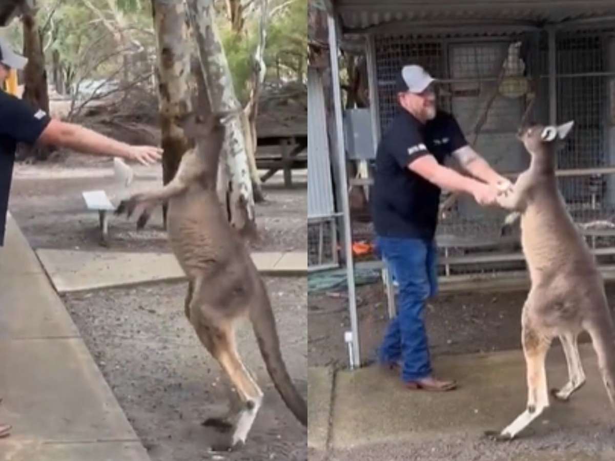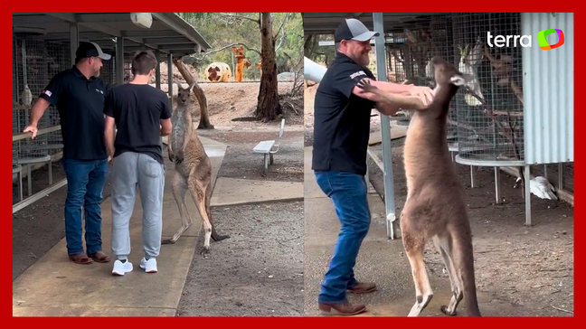 As imagens mostram o canguru 'lutando' com o homem. Em certo momento, ele chuta o canguru para se defender, e o animal continua os ataques. A cena inusitada viralizou nas redes sociais nesta semana.