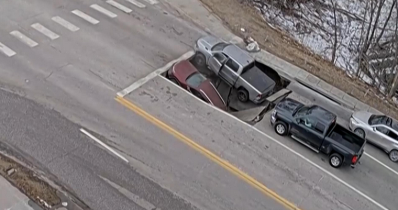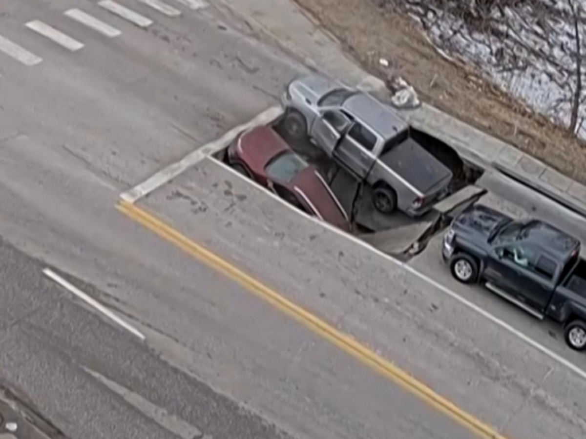 Carros são ‘engolidos’ por buraco que se abre no meio da rua nos EUA