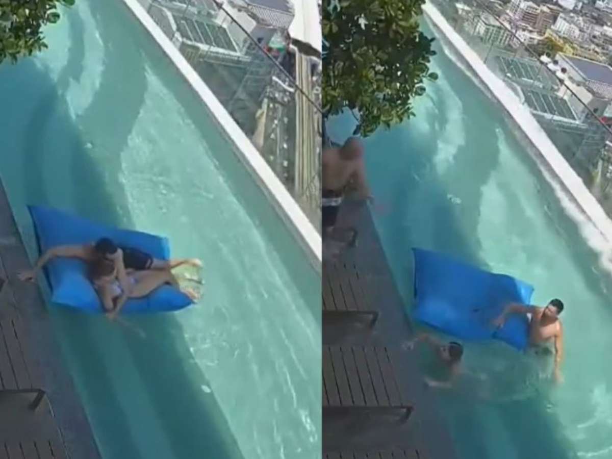 Nas imagens é possível ver os dois deitados em uma boia, enquanto outro homem estava na espreguiçadeira na beira da piscina. Em alguns segundos, os tremores começam e a água passa a cair do empreendimento.