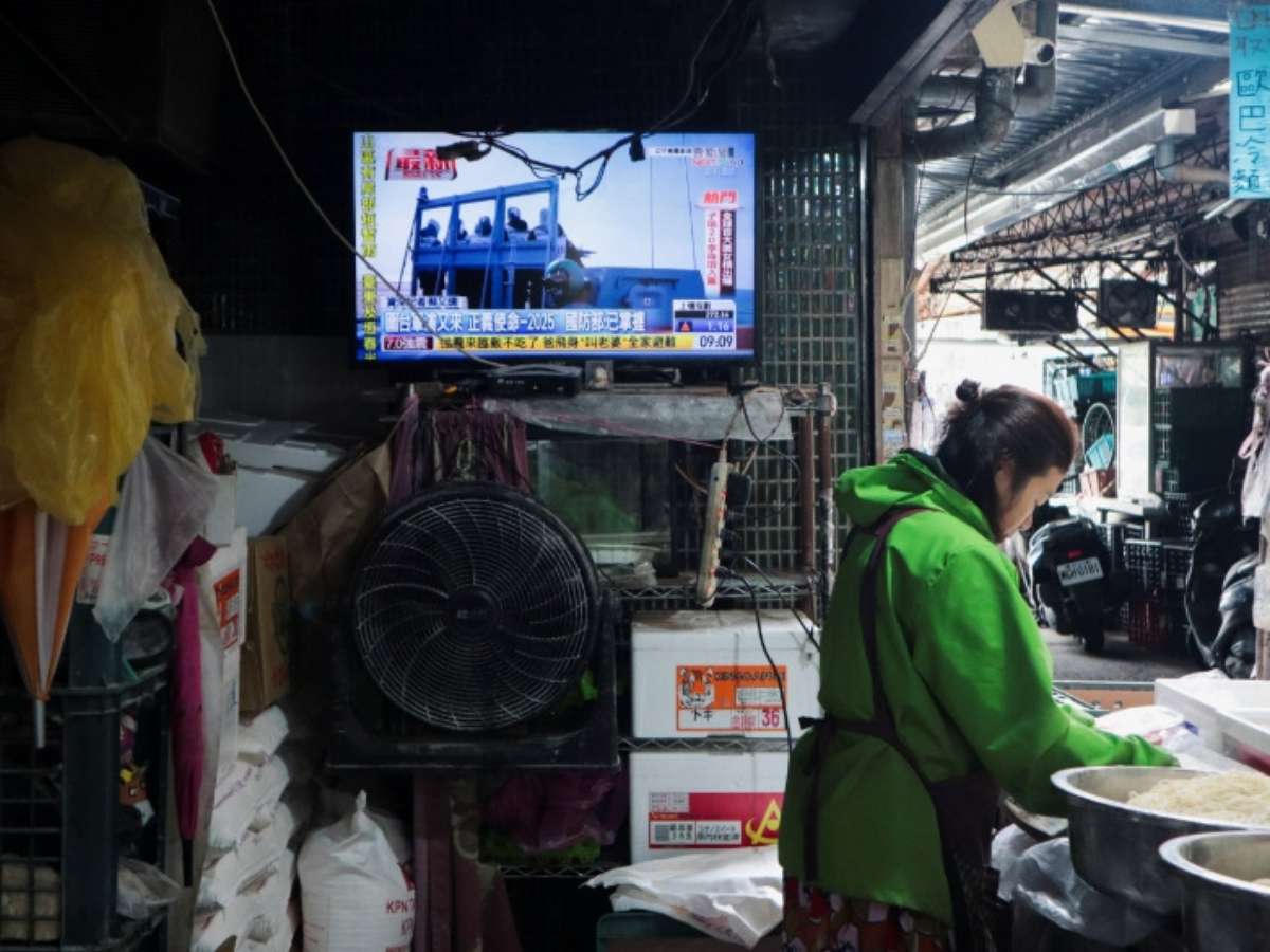 Uma mulher trabalha em uma loja de macarrão perto de uma tela de televisão que exibe uma reportagem sobre os exercícios militares da "Missão Justiça 2025" da China em torno de Taiwan, em Taipei, Taiwan