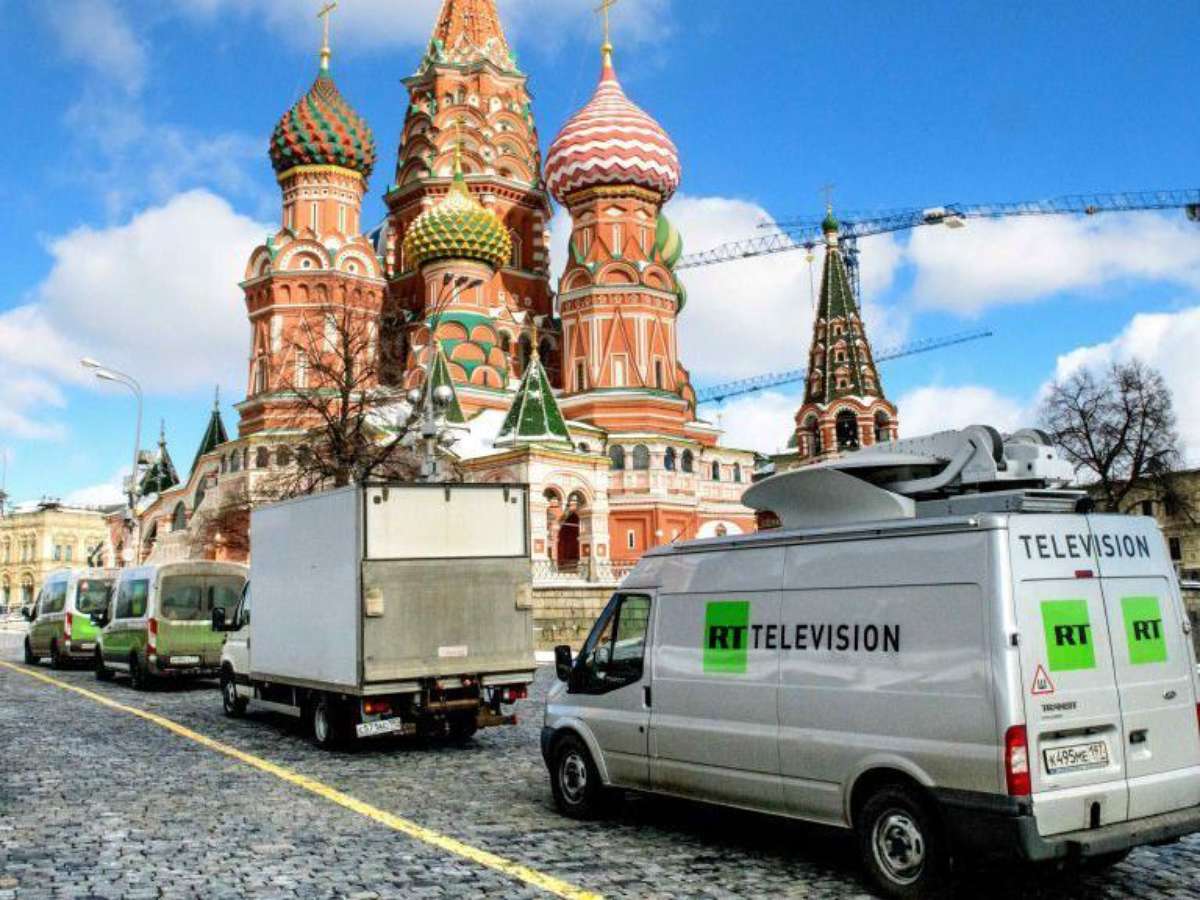Van da TV estatal russa RT estacionada em frente à Catedral de São Basílio e ao Kremlin, em Moscou