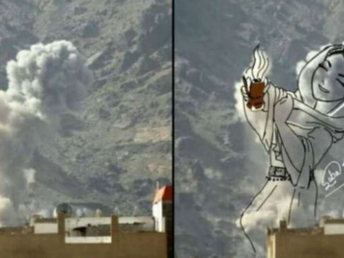Foi então que Jallas decidiu usar seu smartphone para desenhar suas mensagens em fotos de explosões e prédios destruídos no Iêmen, transformando cenas de destruição em imagens de beleza e até esperança.