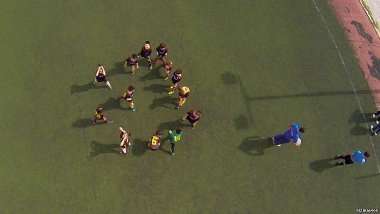 "Gosto muito dessa foto. Trata-se do que chamo de dronie - uma selfie registrada por um drone -. Nada mais é do que uma forma de observar as pessoas alguns metros acima" (Crianças de uma liga de futebol em Atenas, Grécia, preparando-se para um jogo)/ Foto: Rizikianos