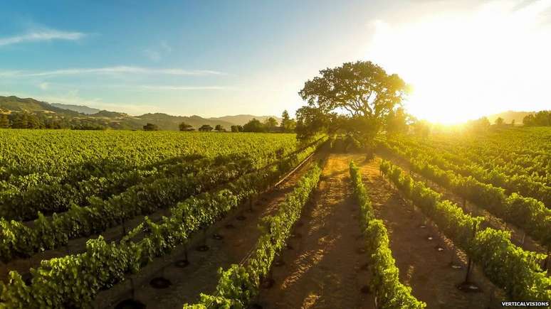 Até agora, entusiastas da fotografia por drone estão ainda experimentando e descobrindo as várias possibilidades do recurso (Pôr do sol em um vinhedo, Santa Inez, Califórnia)/ Foto: Vertical Visions