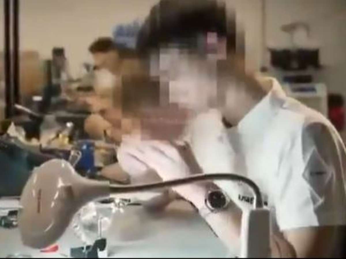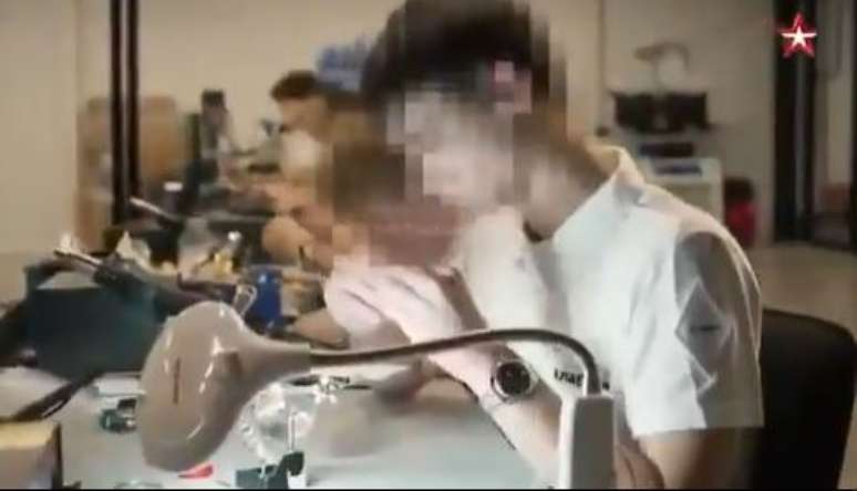 Jovens trabalhadores, inclusive adolescentes, foram mostrados com os rostos desfocados, estudando telas de computador ou fabricando e testando componentes individuais ou montando drones.