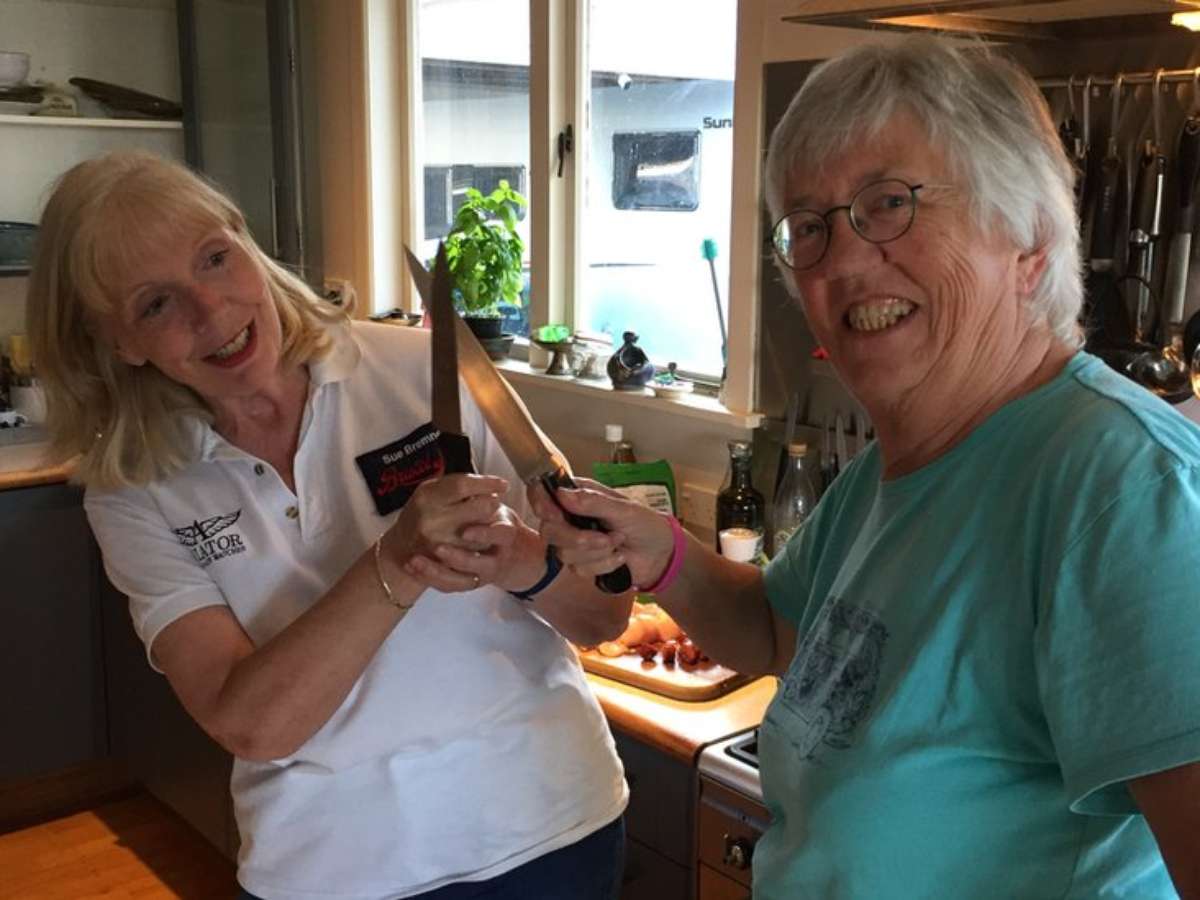 "Estamos nos divertindo muito aqui", diz Sue. "Passamos muito tempo juntos bebendo vinho, cozinhando e nos divertindo."