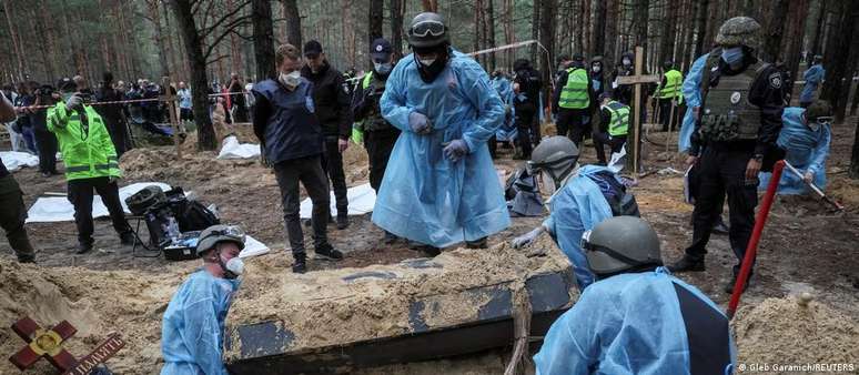 O governador regional, Oleg Sinegubov, relatou que 99% dos corpos exumados nesta sexta-feira apresentavam sinais de morte violenta. "Há provavelmente mais de mil cidadãos ucranianos torturados e mortos em territórios libertados da região de Kharkiv", escreveu nas redes sociais. A área foi retomada em uma contraofensiva ucraniana na semana passada.