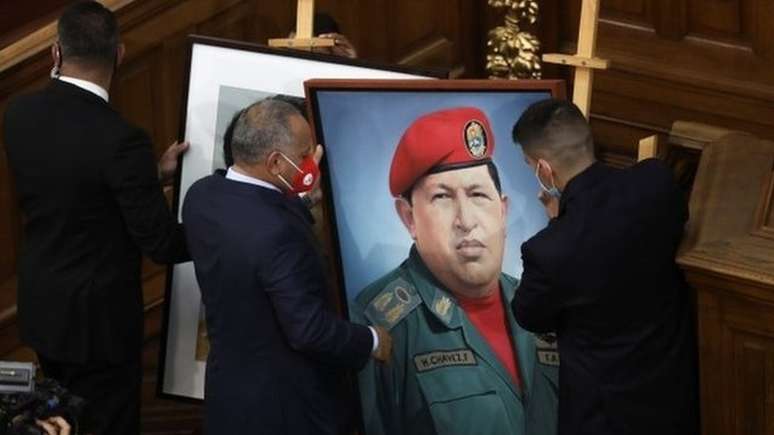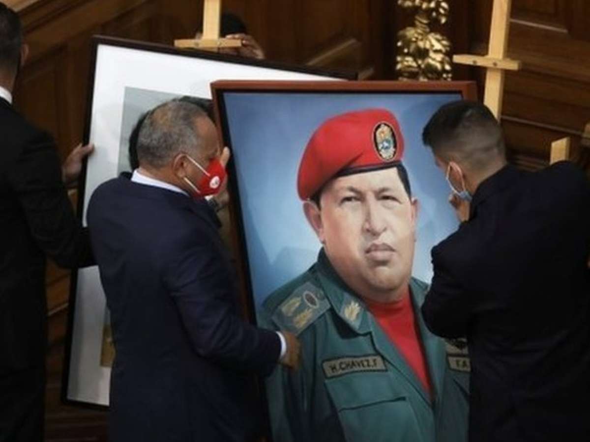 Com a mudança de comando no Parlamento, o quadro com o rosto de Hugo Chávez voltou à Assembleia Nacional.