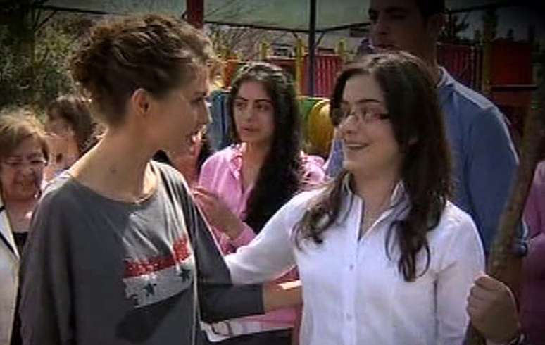 Em imagem retirada de um vídeo, Asma (esq.) veste traje informal, com uma camiseta com a bandeira da Síria