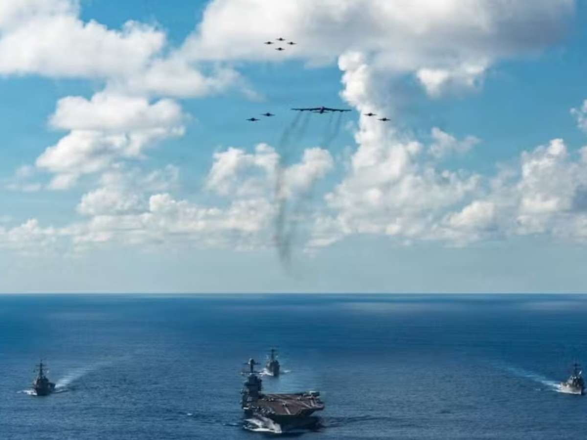 Nas imagens divulgadas pelo governo norte-americano, é possível ver o USS Gerald Ford navegando em formação com as demais embarcações que compõem o grupo de ataque — os destróieres USS Winston Churchill, USS Mahan e USS Bainbridge. Acima da formação, aparecem jatos de ataque e um bombardeiro B-52 Stratofortress.
