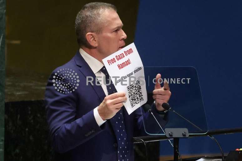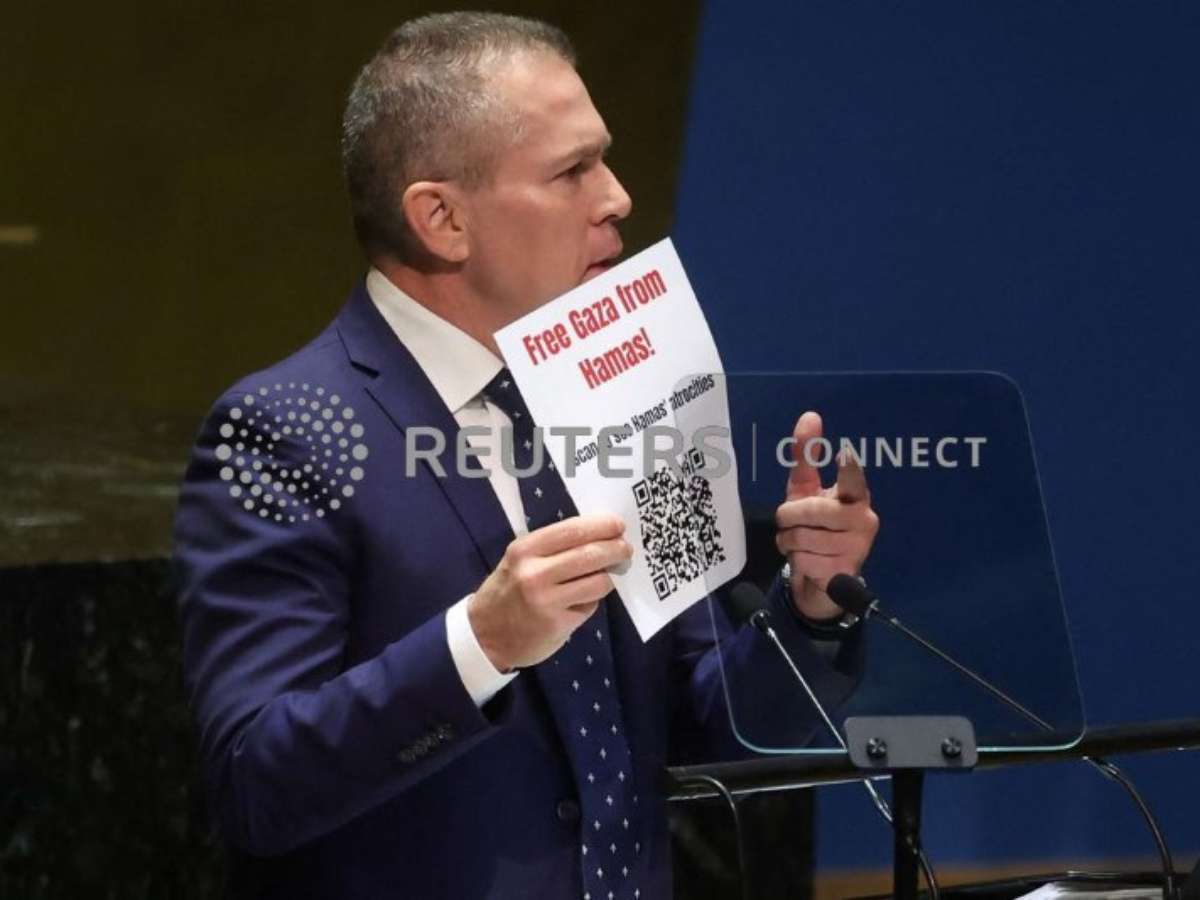 O enviado de Israel às Nações Unidas exibiu à Assembleia Geral de 193 membros nesta quinta-feira um breve vídeo, que segundo ele mostra um combatente do Hamas tentando decapitar um homem com uma ferramenta de jardim durante o ataque de militantes palestinos em 7 de outubro a Israel.
