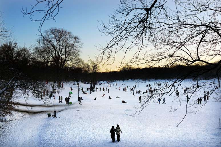 O Central Park, em Nova York, também ficou coberta pela espessa camada de neve