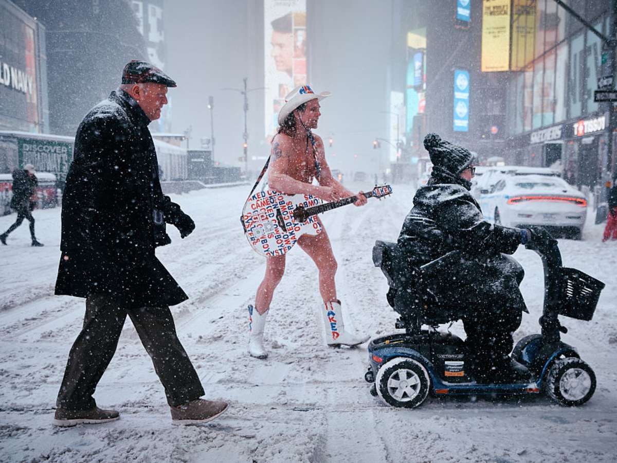 Os alertas para uma das nevascas mais intensas da história dos Estados Unidos não foram capazes de tirar o 'Cowboy Nu' das ruas de Nova Iorque. O personagem, criado pelo musicista Robert Burck, 55, é um ícone da Times Square, cartão-postal da cidade que está entre as mais afetadas pelo temporal.