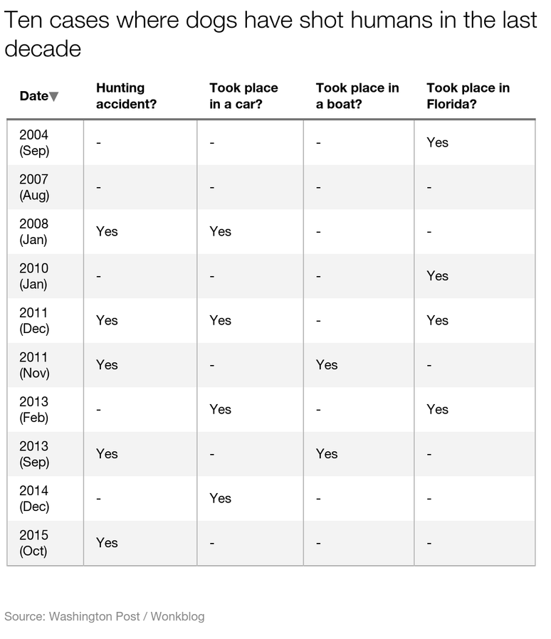 Observou-se que muitos dos incidentes ocorriam durante caçadas. Por exemplo, em 2013, um caçador do estado americano de Minnesota levou um tiro na perna após o cachorro pular em seu barco e disparar a arma. Em 2011, em Utah, também em um barco, o animal disparou contra a nádega do dono ao pisar na arma. Duas semanas depois, na Flórida, um buldogue atirou no dono com um rifle, ao pisar no armamento enquanto eles estavam a caminho de um ponto de caça.