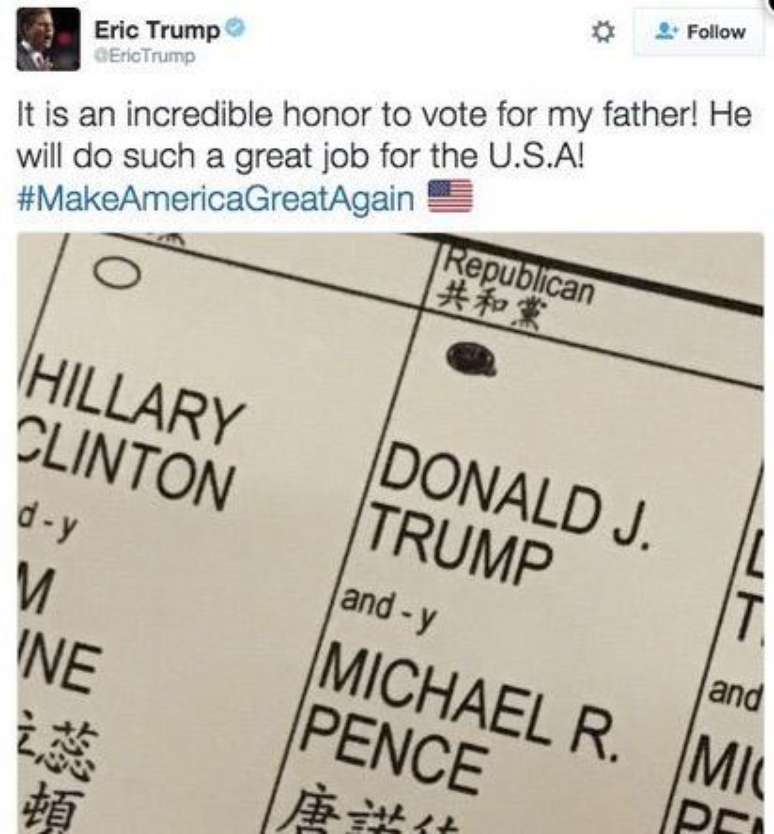 Nova York é um dos 18 estados do país onde é ilegal tirar fotos ou fazer selfies com a cédula, o que Eric Trump parece ter se dado conta depois, ao apagar o tweet do perfil na rede social.