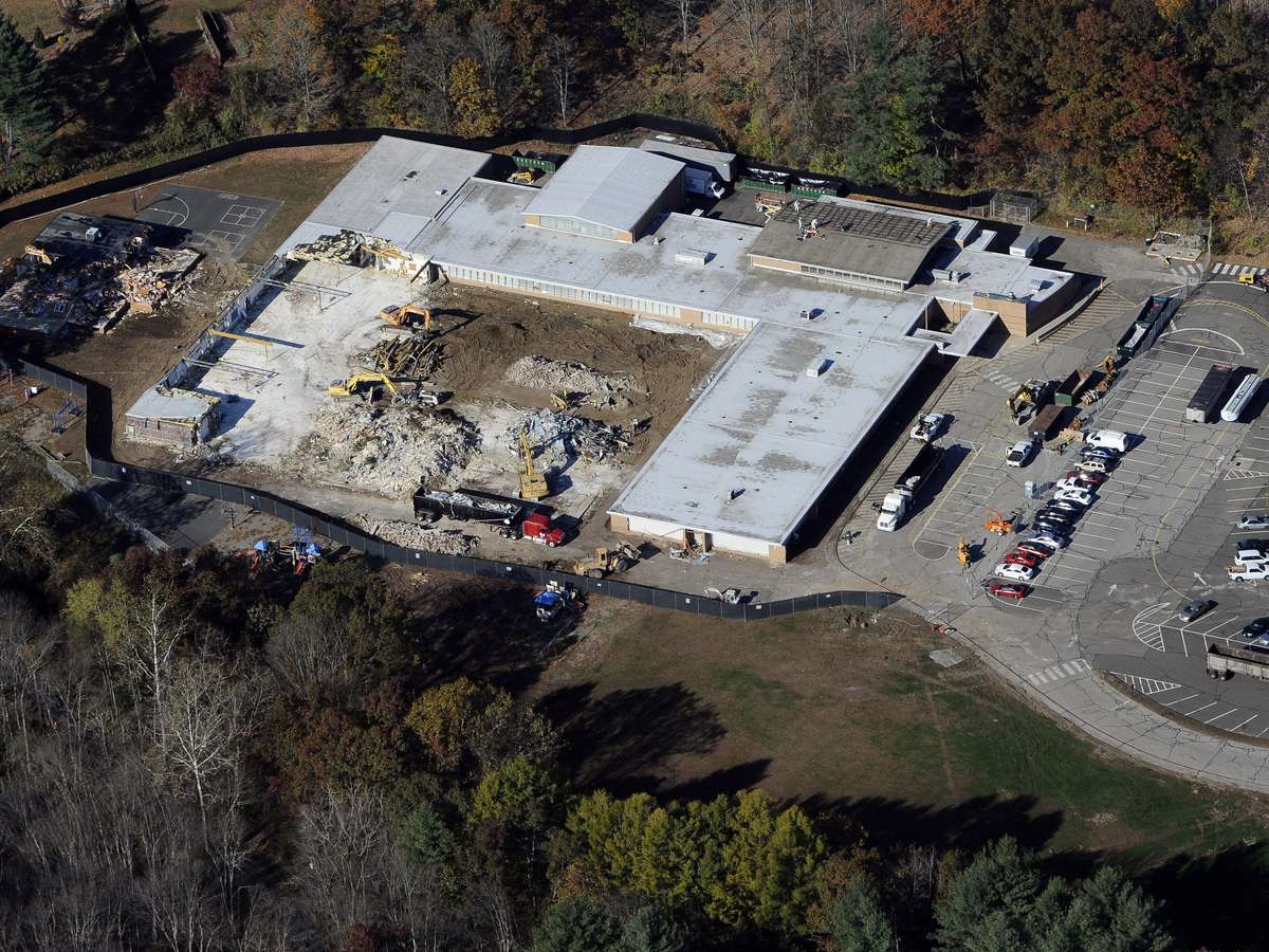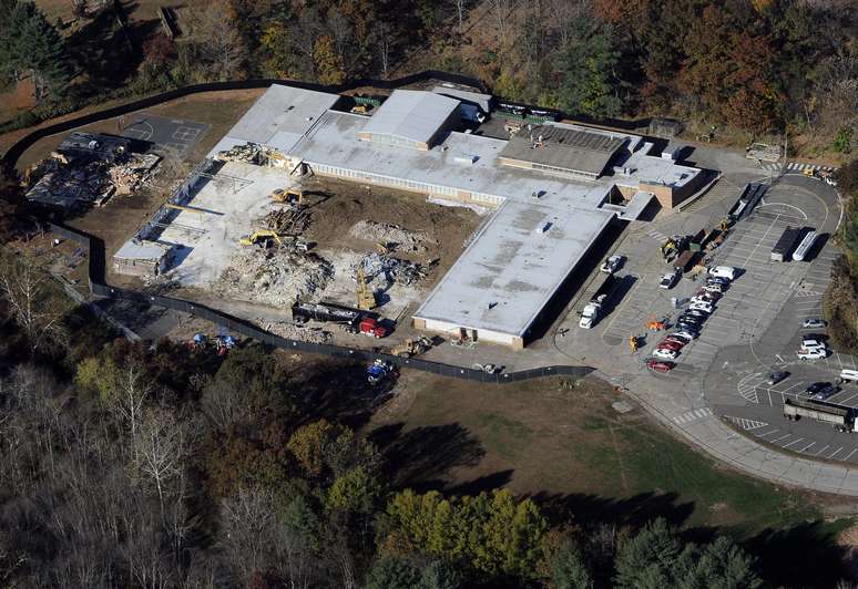 Operários trabalham junto aos destroços durante demolição da Escola Elementar Sandy Hook, em Newtown, no Estado americano de Connecticut. A escola foi palco do massacre que deixou 26 mortos, incluindo 20 crianças, em 14 de dezembro de 2012. O local está sendo demolido desde o final da semana passada. Segundo a agência AP, o processo deve levar múltiplas semanas. Posteriormente, uma nova escola será construída ali. A expectativa é que seja reaberta em dezembro de 2016