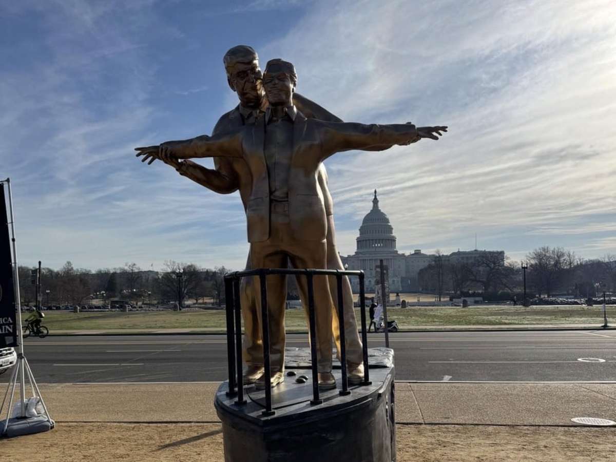 Uma instalação artística polêmica instalada nesta semana em frente ao Congresso dos Estados Unidos, em Washington, D.C., chamou atenção das pessoas que circulavam pelo local. A obra, criada pelo coletivo anônimo Secret Handshake, retrata o presidente Donald Trump ao lado do financista condenado por crimes sexuais Jeffrey Epstein em uma encenação inspirada em uma cena famosa do filme Titanic.