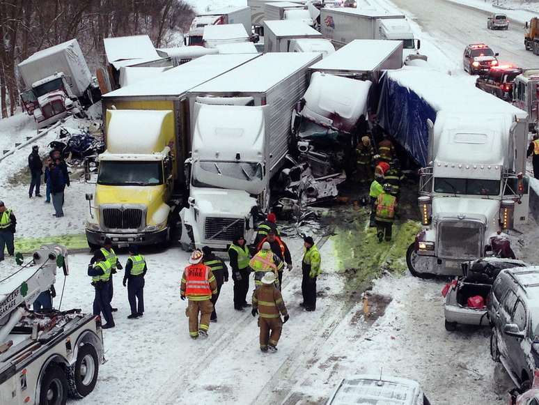 PUBLICIDADE Capa Notícias Mundo Estados Unidos Estados Unidos EUA: engavetamento com mais de 40 veículos deixa ao menos três mortos Compartilhar Acidente envolveu cerca de 30 veículos Foto: AP Acidente envolveu cerca de 30 veículos Foto: AP Pista estava coberta de neve no momento do acidente Foto: AP Imagem de celular mostra vários caminhões envolvidos no engavetamento Foto: AP Compartilhar Publicidade Compartilhar TAGS Estados Unidos Notícias Mundo Publicidade