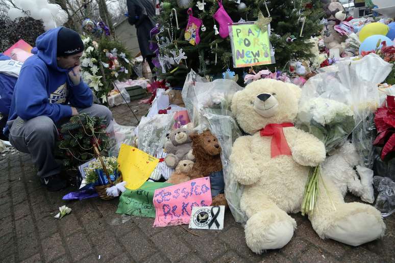 Família deixa flores em memorial próximo da escola de Sandy Hook