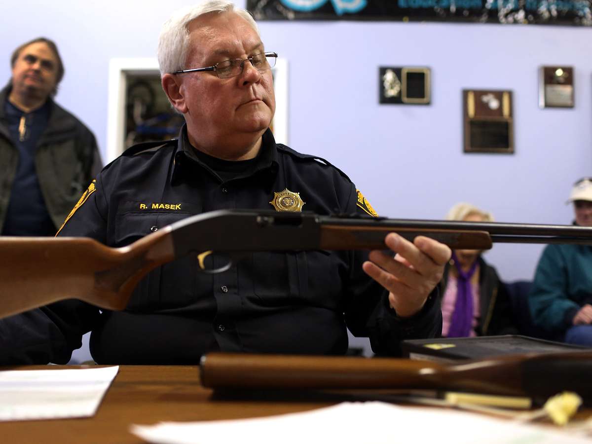O policial Ray Mesek registra rifle entregue ao Departamento de Polícia de Bridgeport, Connecticut. Oito dias após o massacre em uma escola na cidade de Newtown, várias cidades do Estado de Connecticut realizaram neste sábado eventos de entrega de armas em troca de dinheiro. O programa local determinou que serão entregues US$ 200 para pistolas e revólveres, US$ 75 para rifles e um valor maior a ser determinado por armas de assalto