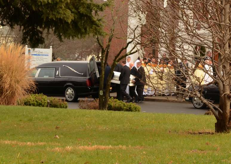Ataúde levando o corpo de menino de 6 anos morto no massacre na escolar Sandy Hook chega à igreja para ser velado, em Newtown