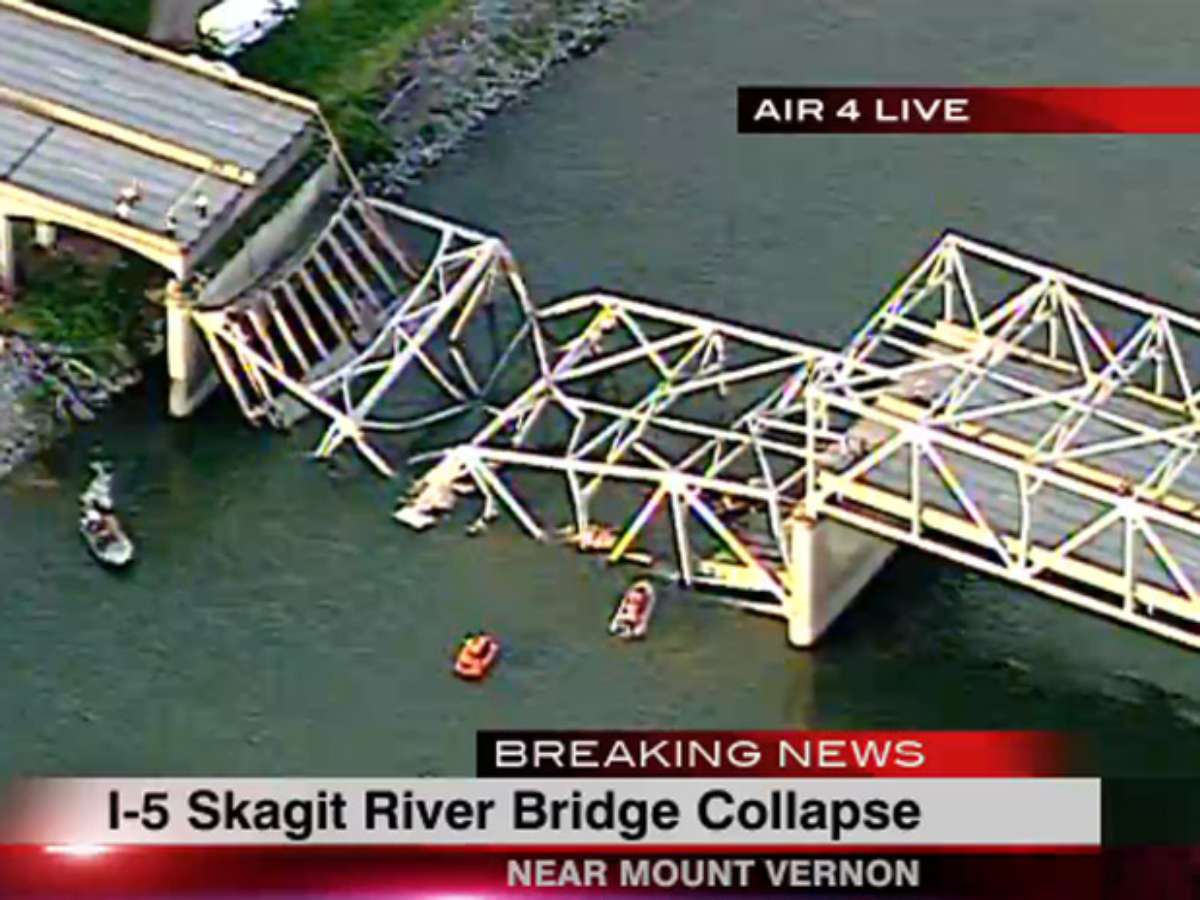 23 de maio - Socorristas resgatam mulher de um dos carros que caiu na água. Algumas testemunhas que presenciaram a queda da ponte sobre o rio asseguraram à emissora local KIRO7 que um caminhão de grande tonelagem se chocou contra com um dos pilares laterais da estrutura, o que poderia ter causado a ruptura da mesma e, posteriormente, sua queda
